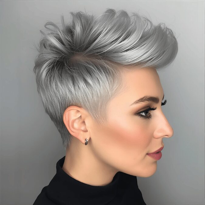 In spite of the grayest winter days, this voluminous silver pixie is sure to make a bold statement! Featuring a gorgeous lift at the crown and close-cropped sides, this is a style that commands attention. Its silver tone gives it a cool, frosty edge that is perfect for winter!