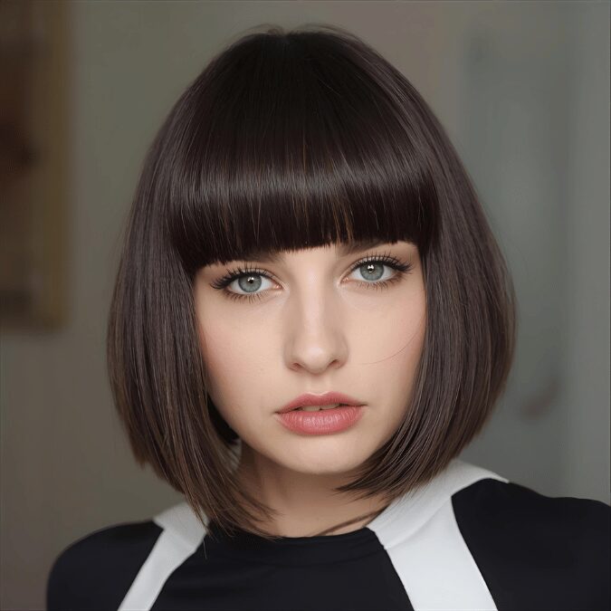 You’ll love the classic vibes this cut gives you, but it’s versatile enough to keep things fresh and modern as well. Blunt bangs sit right above the eyebrows, creating a striking frame that draws attention to your eyes. Just ask your stylist to keep your bangs slightly thick as well.