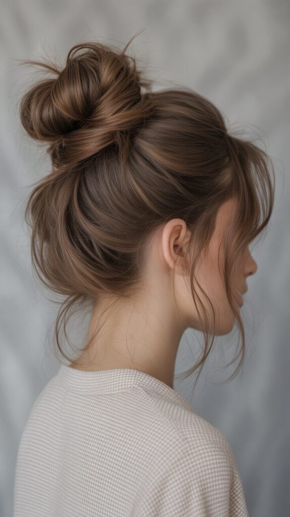 The messy bun is quick and relaxed. It looks stylish without precision. Loose strands keep it soft and casual. Suitable for busy days. Works for all hair textures. Easy to style with minimal effort. A popular simple hairstyle.