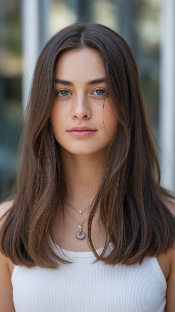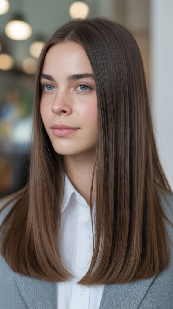 Straight shoulder-length hair stays manageable for a long time. It looks clean and balanced, and works well for work or casual settings. It only requires minimal trimming. It is easy to maintain long-term. This is a simple, yet reliable haircut.