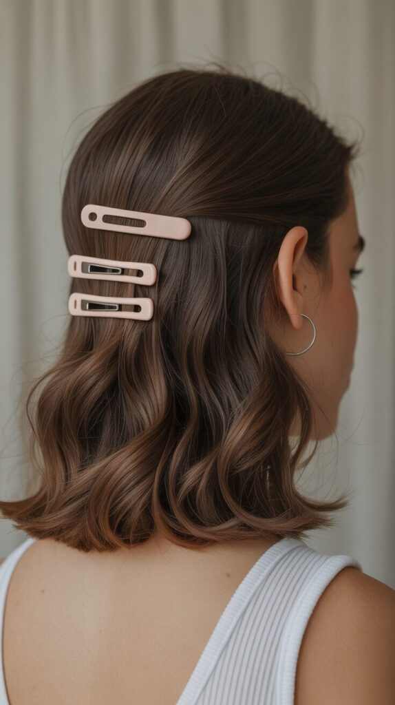 Using simple hair clips creates a clean look. This style works well for medium lengths. It keeps hair controlled. No heat styling needed. Suitable for quick fixes. Looks neat and effortless. A simple styling solution.