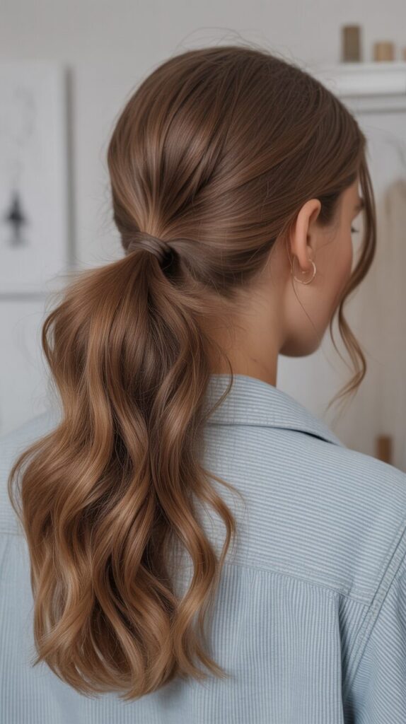 Having a loose ponytail feels relaxed and natural. It avoids tight tension on the scalp. It will go well with casual wear. This hairstyle is suitable for everyday use. It works well on second-day hair. It is easy to style. It looks soft and modern.