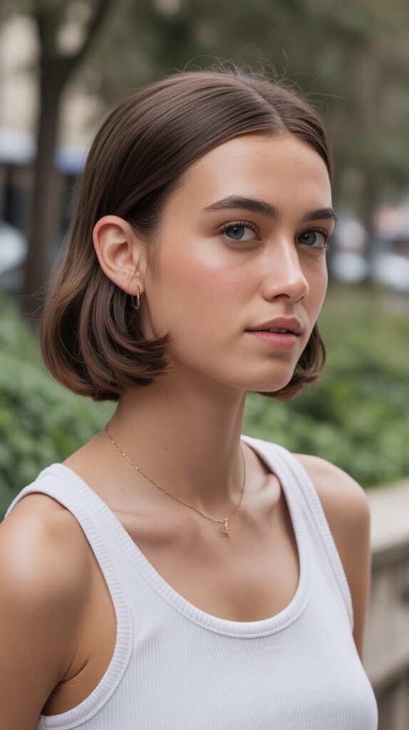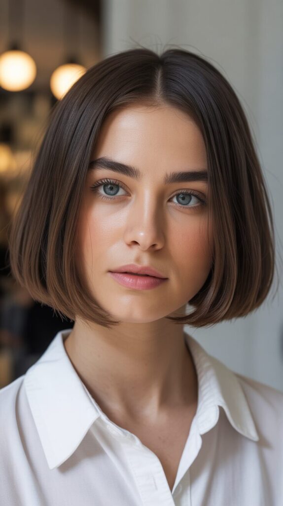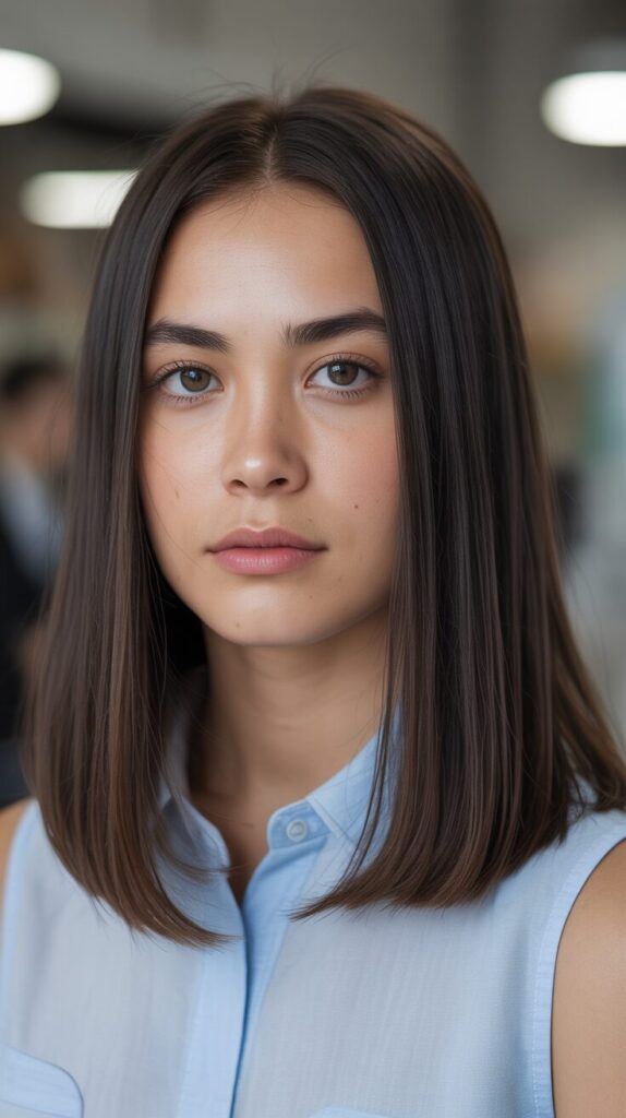 A sleek bob looks simple and modern. This haircut needs minimal styling. It keeps hair light and manageable. Works well for straight or slightly wavy hair. Suitable for professional environments. Easy daily maintenance. A clean and confident choice.