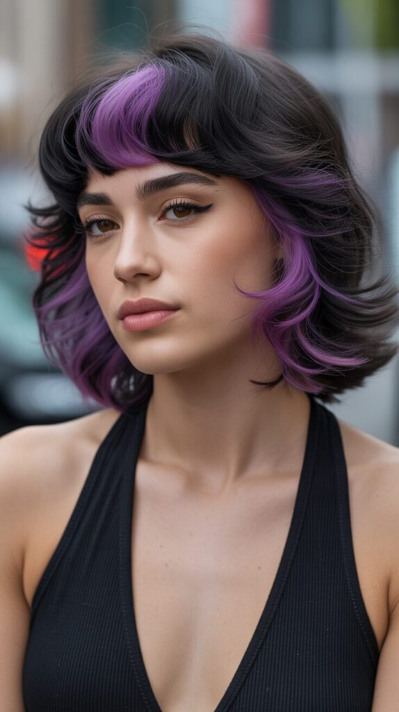 Featuring a medium black soft mullet with micro bangs and purple highlights, the medium black soft mullet offers a bold and vibrant way to express one’s personality while combining edginess and a pop of color.