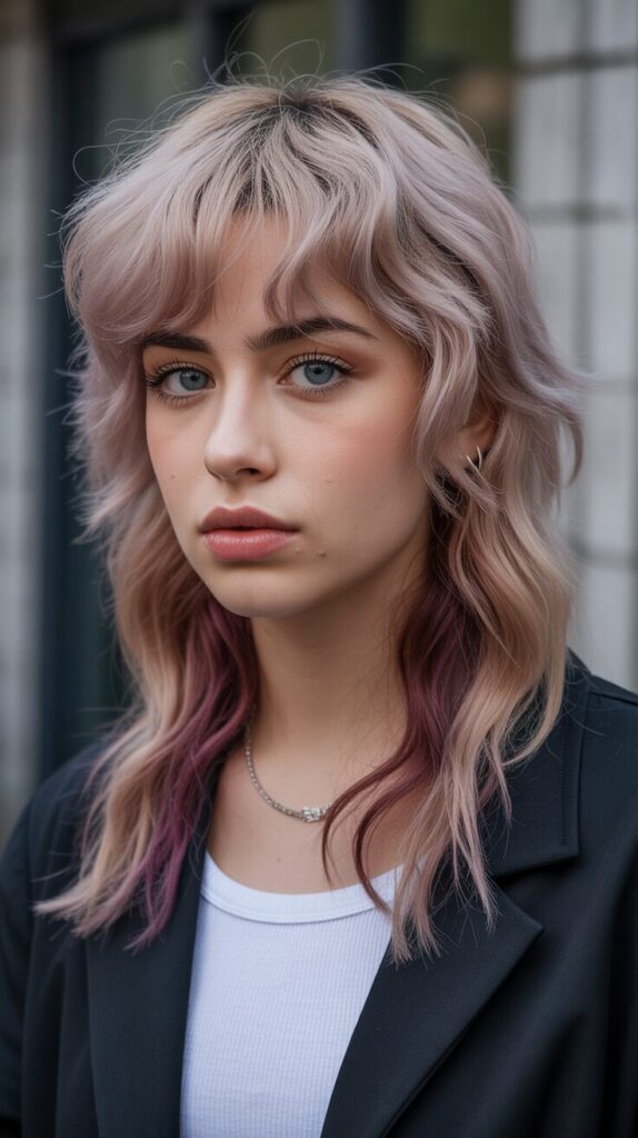 It’s all about embracing the punk-inspired aesthetic with this multicoloured soft shabby mullet with blunt bangs, a daring and edgy look that commands attention with its edgy look.