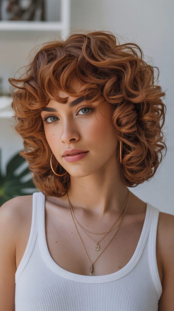 A Curly Soft Mullet With Curly Bangs has been designed to offer a playful and carefree look, showcasing the beauty of curls in a trendy and modern haircut that highlights its natural beauty.