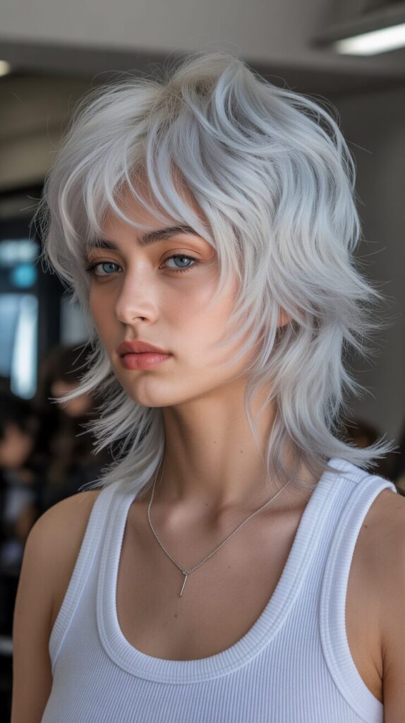 Shaggy Mullet on Silver Hair captures a contemporary aesthetic with its shaggy layers and silver hue, showcasing a perfect blend of style and sophistication with its shaggy layers and silver hue showcasing a trendy and sophisticated aesthetic.
