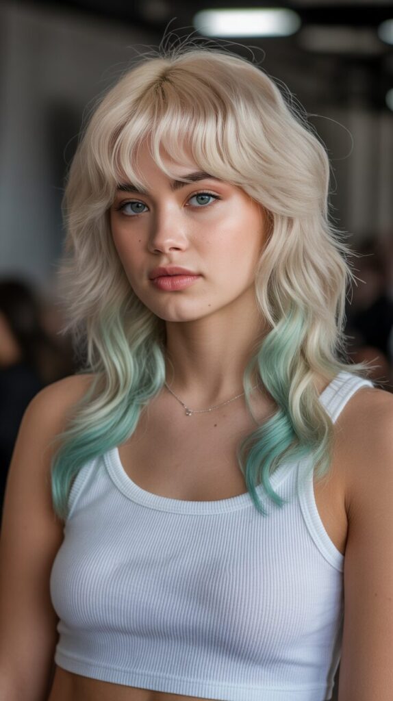 Mullet with curtain bangs and mint green highlights in bleached blonde
