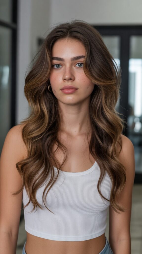 The long brown wavy soft mullet offers an effortlessly chic look, combining length and waves for a style that is equally relaxed and fashion-forward.