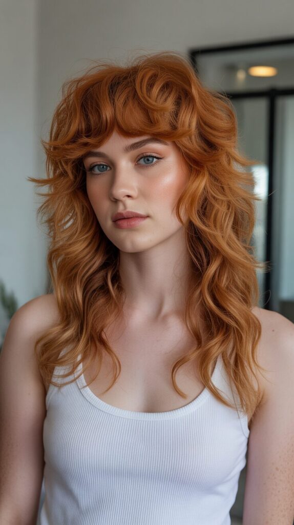 You will be sure to make a statement with a Wavy Shaggy Ginger Soft Mullet, featuring bangs to add an element of whimsy to this bold and unconventional hairstyle that will truly turn heads.