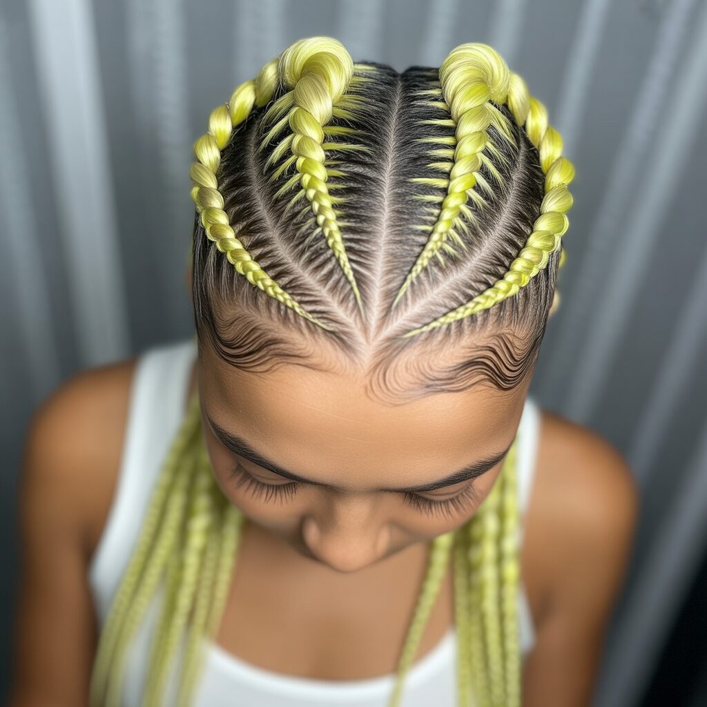 This braided hairstyle adds interest to lemonade braids with swirled patterns convergent into a heart shape at the end. The heart shape adds the right amount of panache and romance to the style, making it a delightful choice for someone who wishes to lend their look a soft feminine touch.