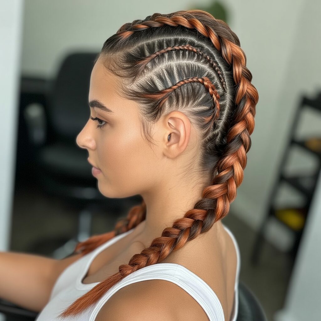With its side swirl braids and copper highlights, this hairstyle creates a sense of warmth that embodies the warmth of the hairstyle. It is a great choice for those who are willing to experiment with color and design, as it enhances the depth and texture of the swirl pattern to create a visually stunning and dynamic look.