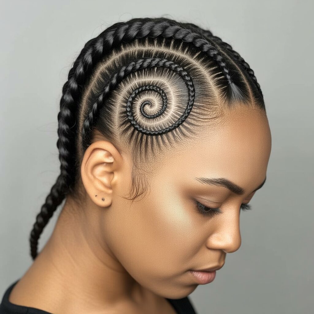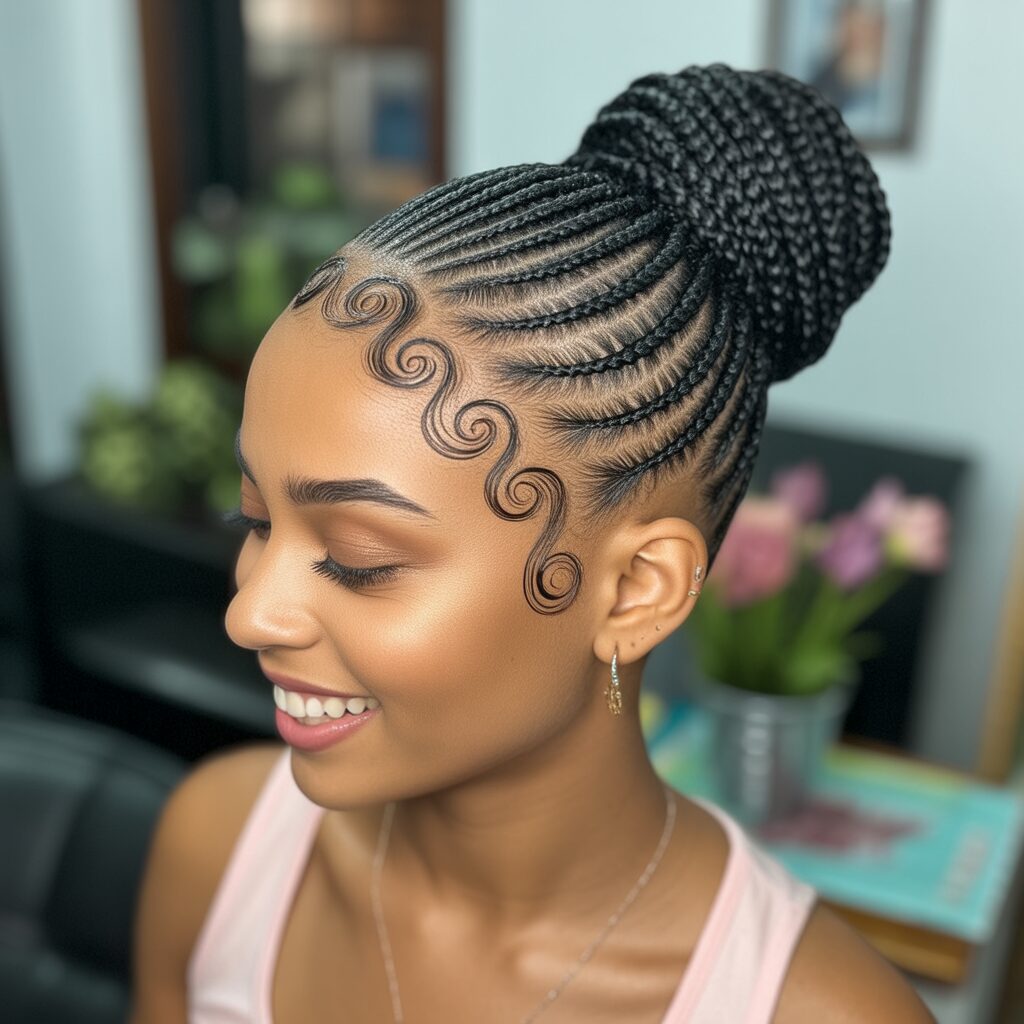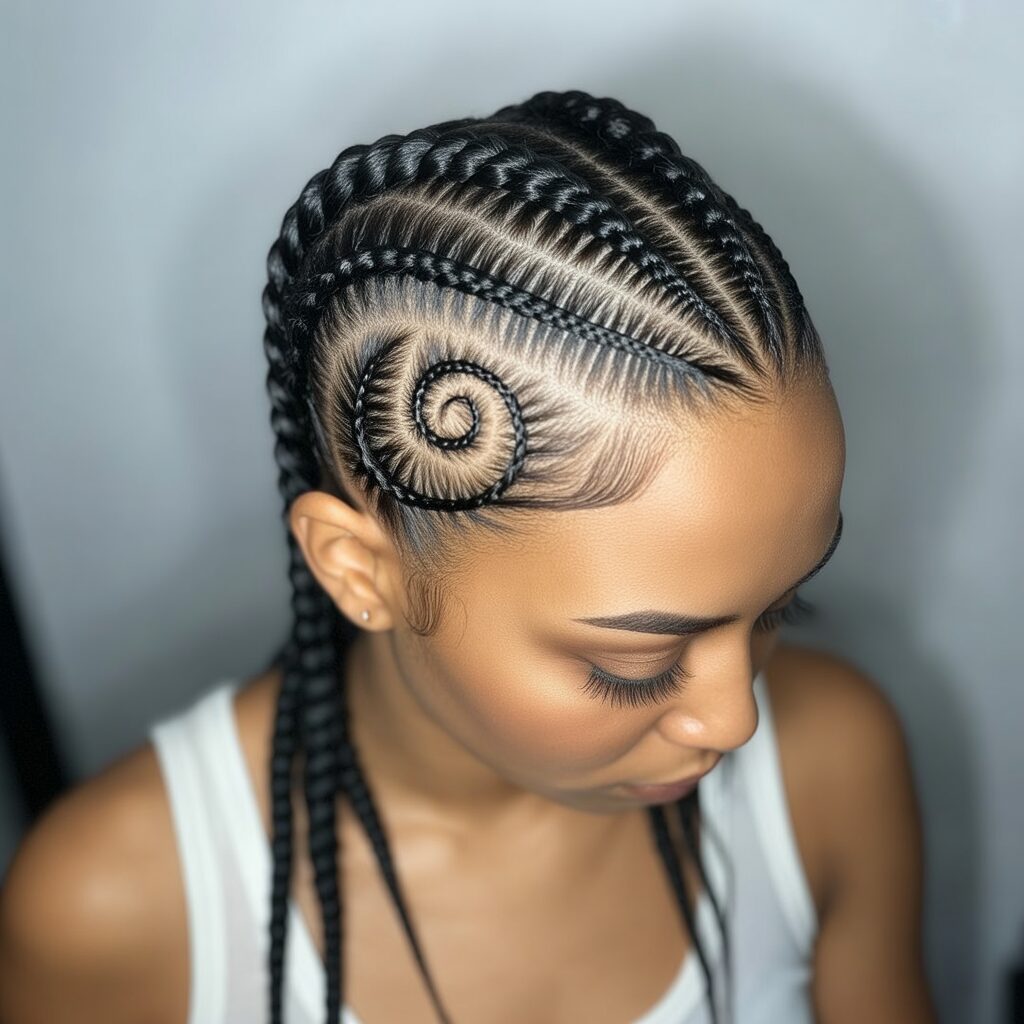This hairstyle, which combines swirl cornrows with a bun, is delightfully elegant and versatile. The swirl cornrows add a touch of flair to the overall look, while the bun provides a classic and polished look. This style can be worn casually as well as in a more formal setting.