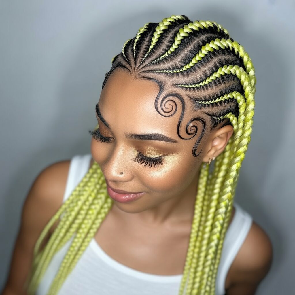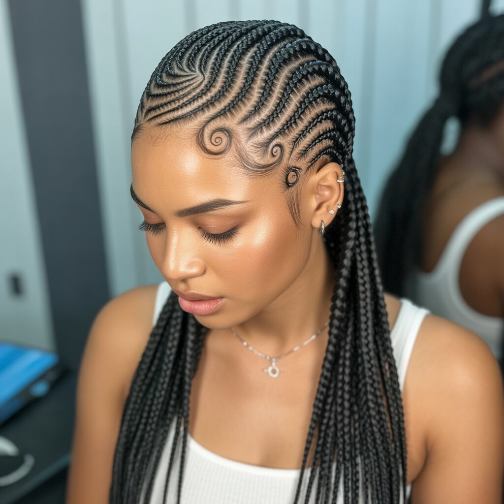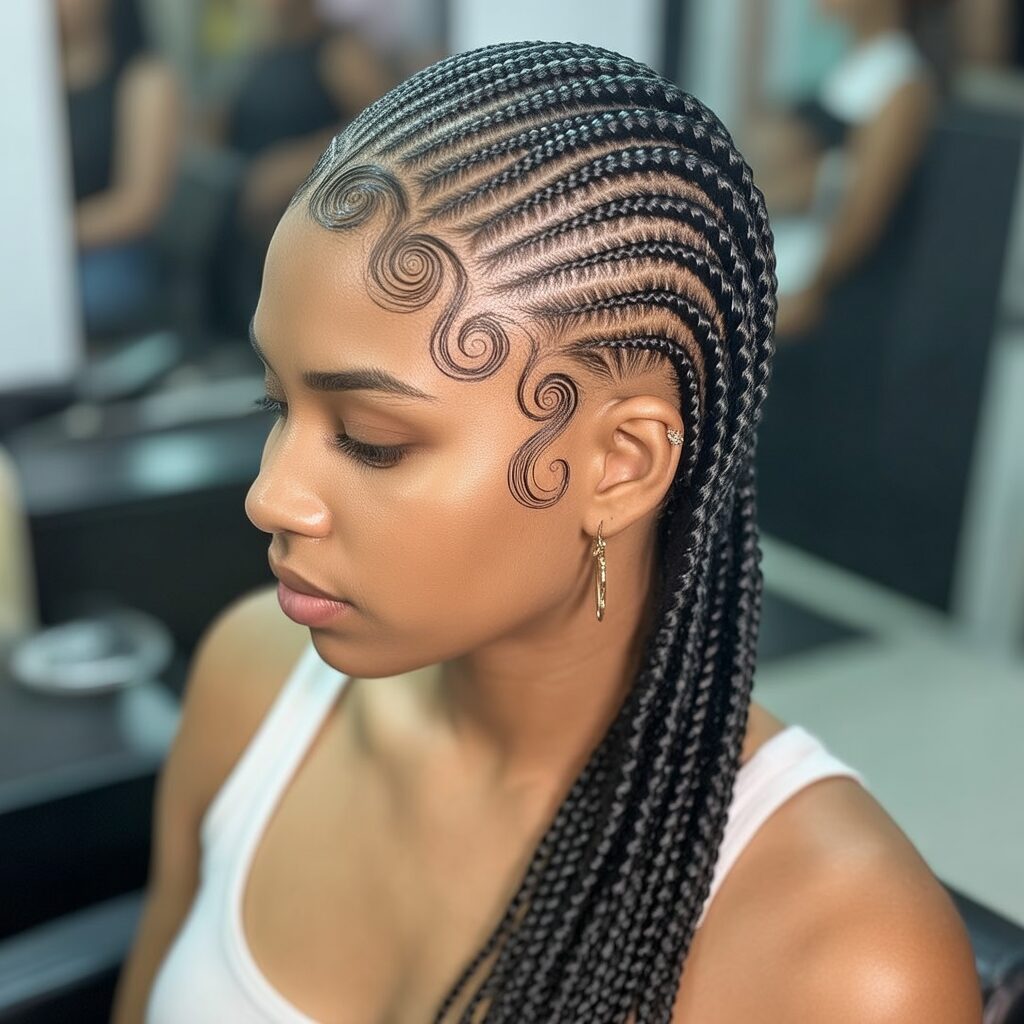 This hairstyle, which combines swirl cornrows with a bun, is delightfully elegant and versatile. The swirl cornrows add a touch of flair to the overall look, while the bun provides a classic and polished look. This style can be worn casually as well as in a more formal setting.