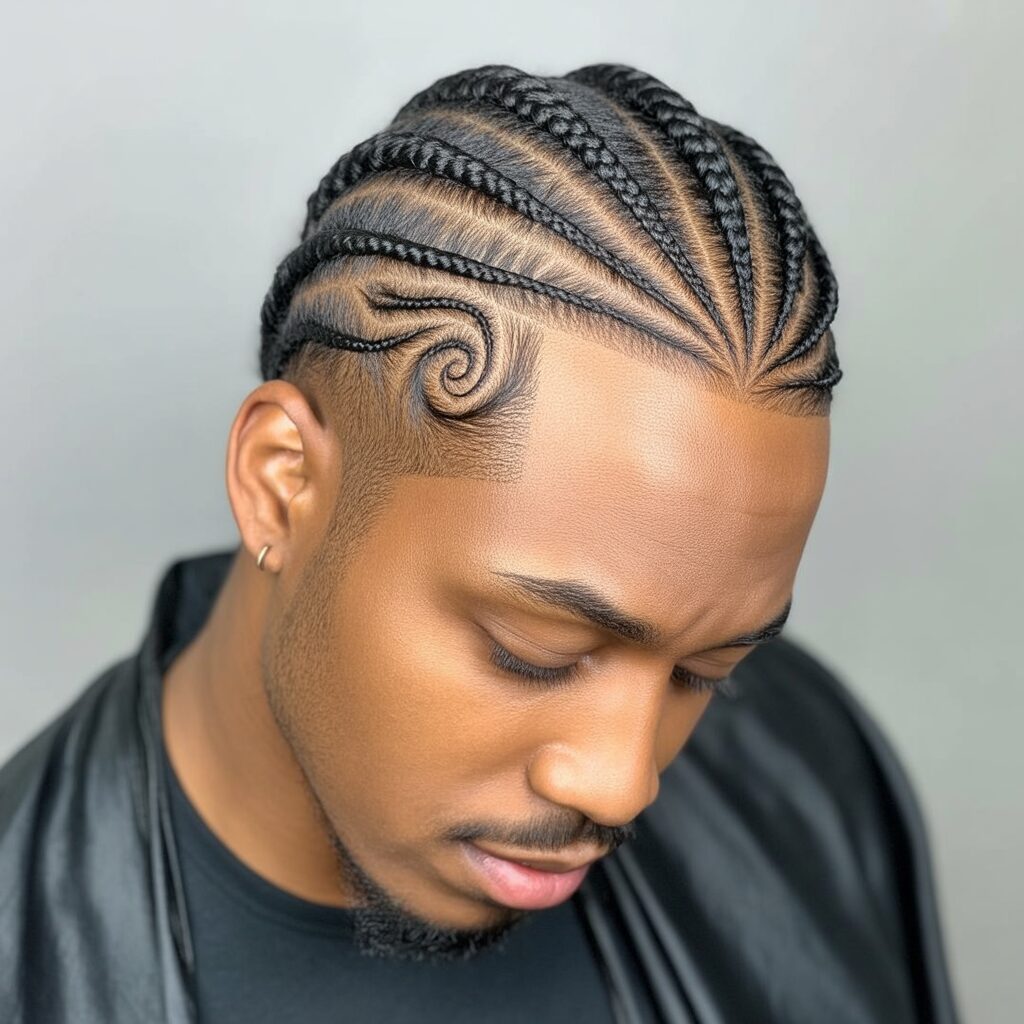 With this freestyle design, men can embrace the artistry of swirl cornrows and embrace the artistry of braided hairstyles. The cornrows are arranged in a swirling pattern, creating a contemporary take on traditional braided hairstyles. This look is perfect for men looking for a distinctive and contemporary look.