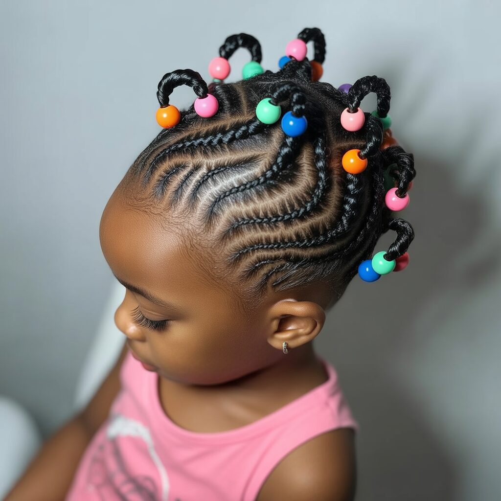 This hairstyle was created with the playful energy of children in mind. The hairstyle is characterized by freestyle swirl cornrows embellished with colorful beads. These colorful beads enhance the fun and lively appeal of the hairstyle, making it a wonderful choice for children who want to look stylish and vibrant.