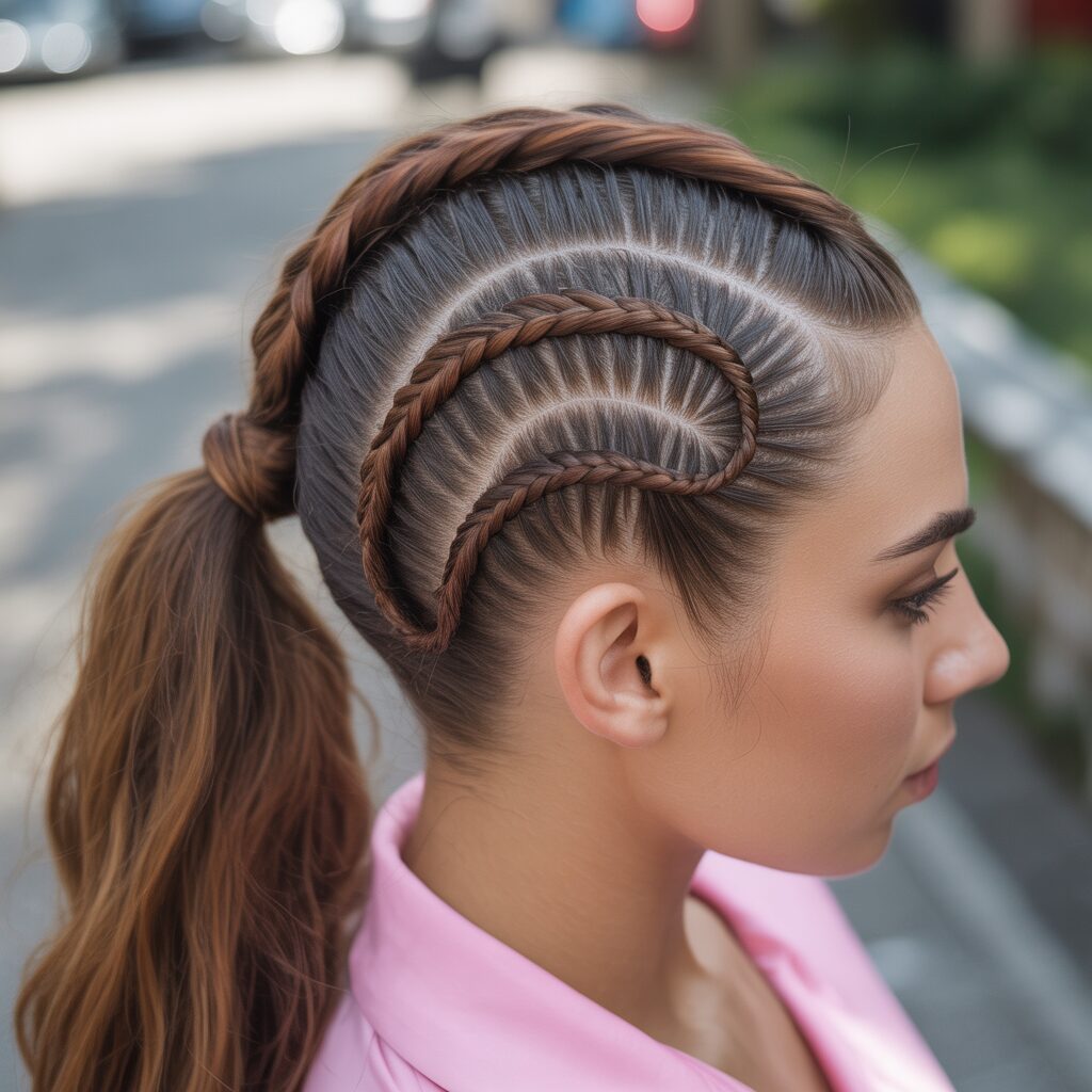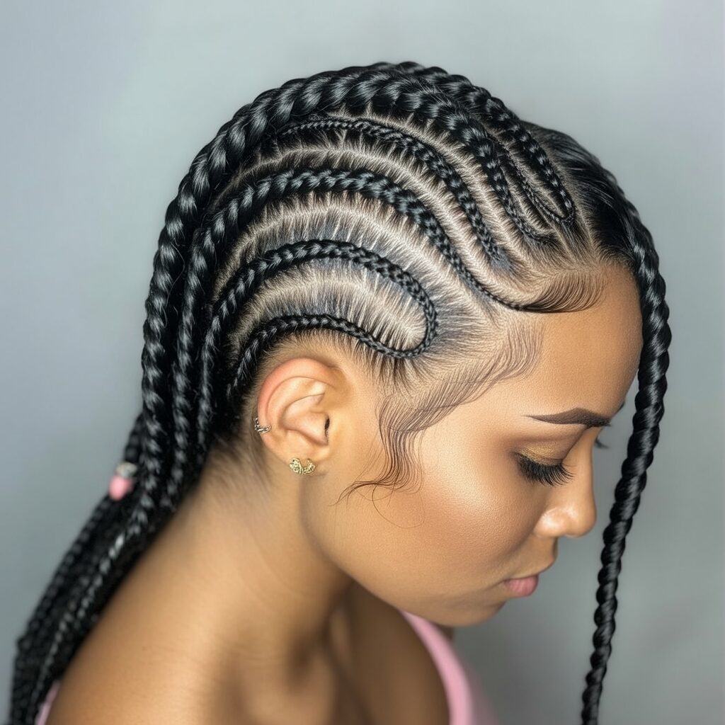 As a result of the intricate style combining the elegance of a ponytail with the artistic flair of swirl cornrows, this hairstyle is perfect for those who appreciate creativity and precision. As the three braids form a swirling pattern, the curved stitch method adds a polished finish to the braid.