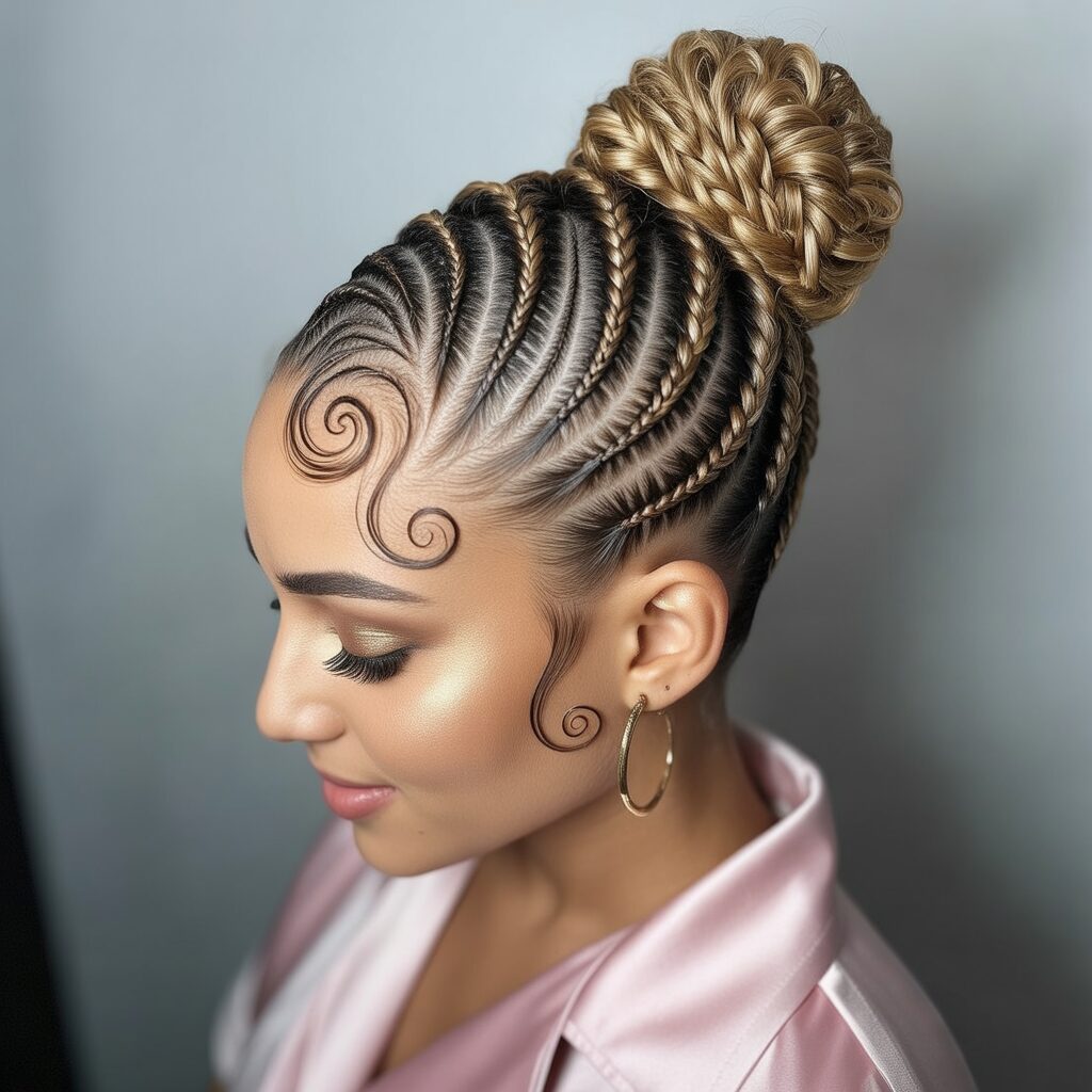 This sophisticated and chic hairstyle uses a braided bun along with swirling cornrows, adding a touch of glamour to a graceful bun, making it suitable for elegant occasions. The swirl pattern adds a touch of sophistication to the style, making it an excellent choice for those who would like to look stylish and sophisticated.