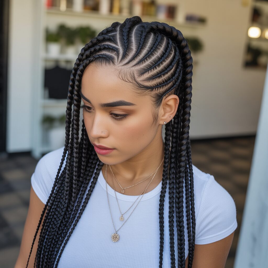 A trendy and fashionable hairstyle for this season is a combination of swirl cornrows seamlessly transitioning into long knotless braids. The knotless braids add a modern touch to the swirl cornrows, creating a stylish and attractive hairstyle.