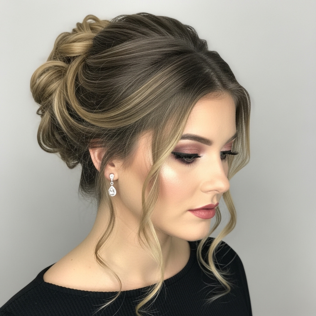 With loose strands around the face, this updo conveys refined romance. With its softness and femininity, this hairstyle pairs perfectly with formal outfits and bold makeup. It is perfect for a wedding, dinner party, or a special Valentine’s day celebration. Despite maintaining a romantic, approachable finish, the style feels polished.