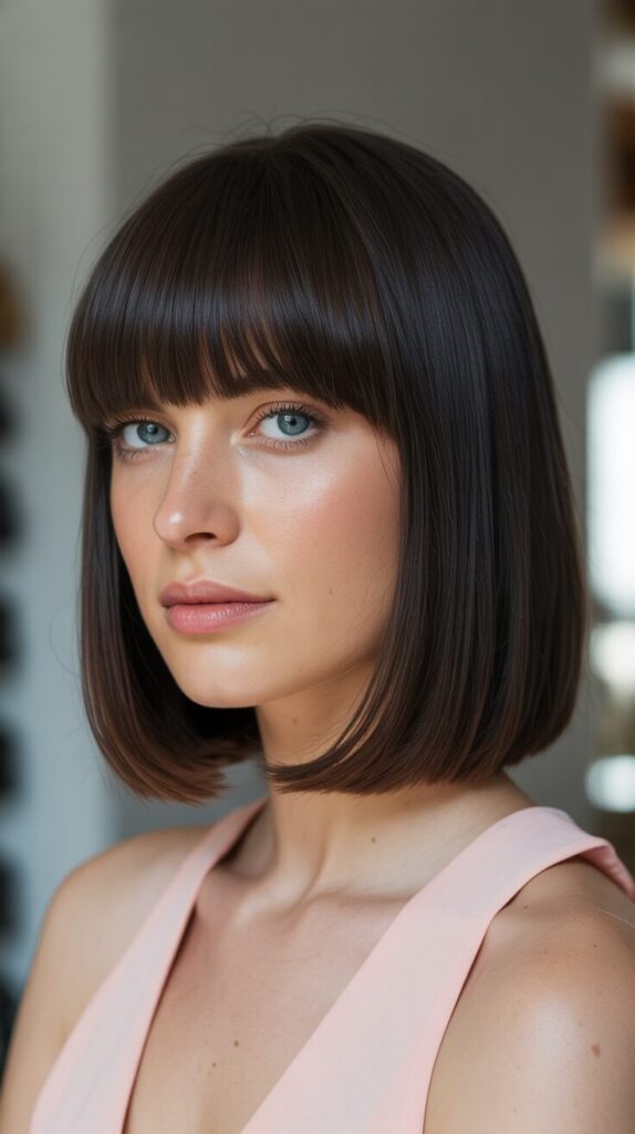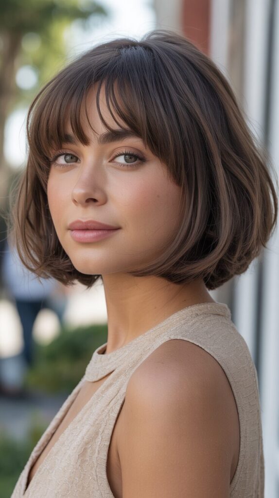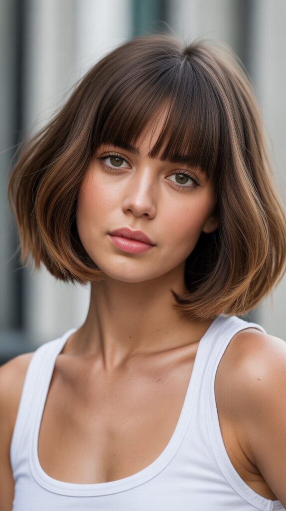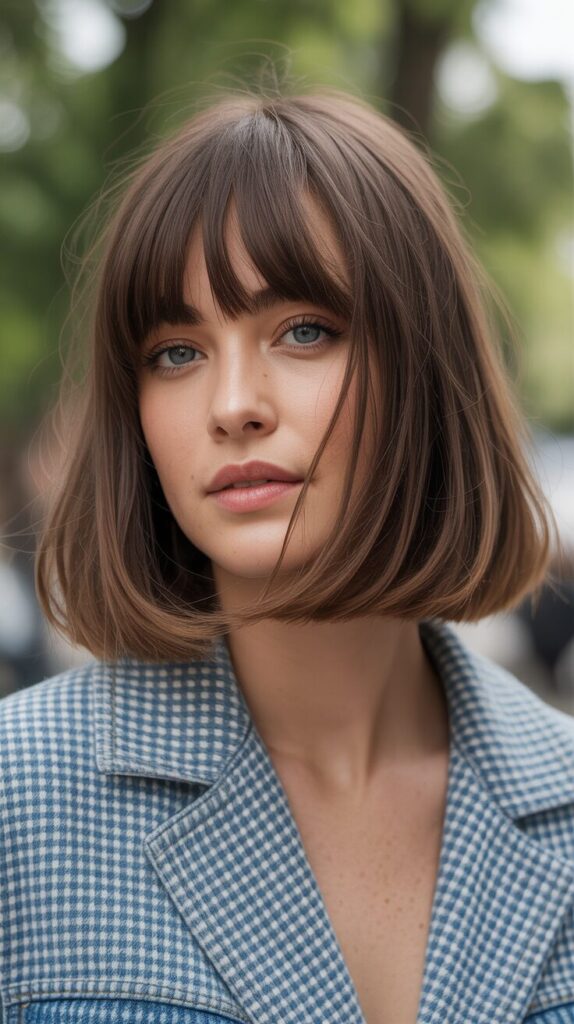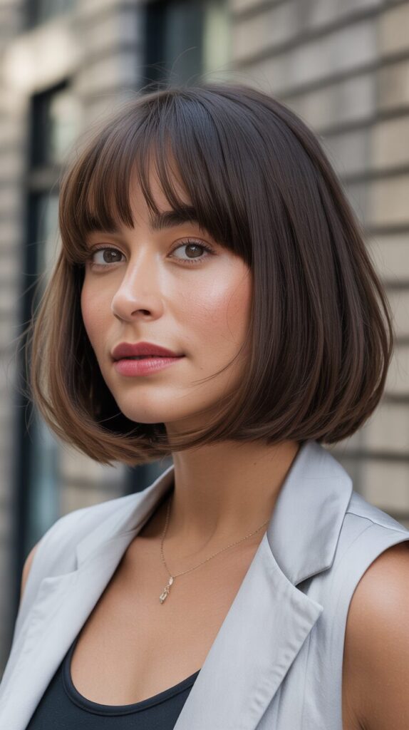 With softly layered ends, this long bob is kept light and full, requiring minimal styling effort. The bangs add just the right amount of structure to balance it out, and it works quite well for those whose hair tends to fall flat, giving it some lift and movement.