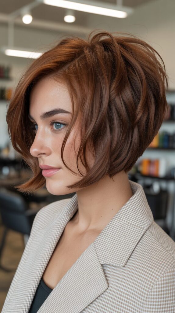 This bob has a very steep angle, which results in natural lift, compounded by layers that prevent any flat sections from forming. Texturizing adds that lived-in appearance that is both stylish and practical even when you wash and go. This cut is perfect for thin or fine hair that would benefit from some dimension.