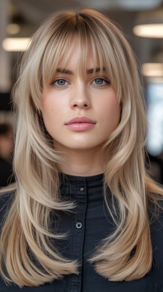 Longer, fuller hair is created softly and comfortably by gentle layers without sacrificing length or fullness. With the bangs being cut with enough texture, it does not look like a straight line across your forehead. The layers give a little style to long hair that’s straight without the need for blowouts or curling irons to make it look finished.