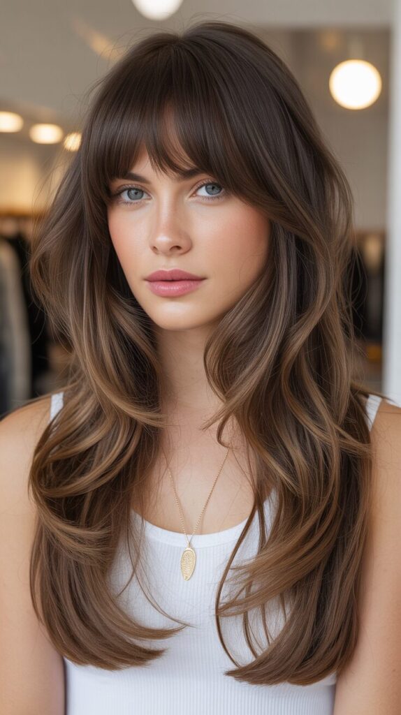 Having layers on long hair is a great way to prevent that heavy, weighted-down feeling that comes with one-length styles. You can also add a soft fringe near your face as well, which gives your whole look depth and adds shape. If you decide to grow out your bangs, they are soft enough to grow out gracefully after a while.