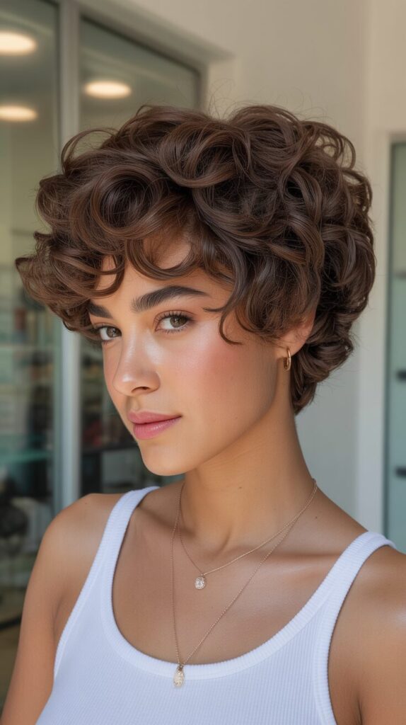 There are several ways to manage curly hair effectively with a short haircut. The layers add easy volume to coily hair while keeping everything neat and tidy. The short haircut naturally lifts at the roots, so you don’t look weighed down.