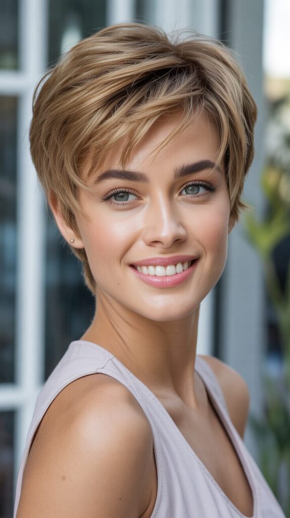 This short cut brings out your best features while staying incredibly easy to manage. In addition, with its light length and minimal styling, the bangs dry into place naturally without any effort on your part. As the layers dry, they settle smoothly and easily, providing you with a clean, easy finish that is perfect for every day wear.