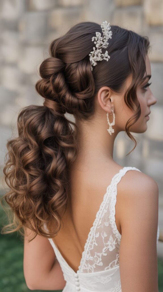 Curly ponytails combine elegance with comfort. They keep hair secure and stylish, and they highlight curls beautifully. Suitable for fusion outfits, a curly ponytail is a fashionable and practical wedding hairstyle.
