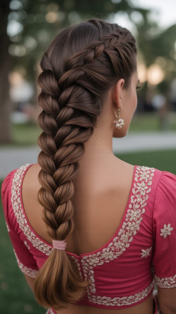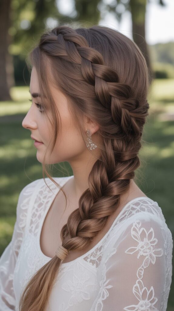 With a braided crown, it creates a look that is very royal, and it frames the face perfectly. This hairstyle works best for long hair, staying secure and elegant throughout the entire day. It is perfect for a traditional wedding.