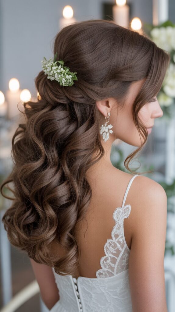 It is quite common for half-up hairstyles to balance structure and flow beautifully. Long hair stays neatly controlled while still looking full. This style emphasizes the face beautifully. This style can be worn with curls or waves, and is ideal for brides and bridesmaids.