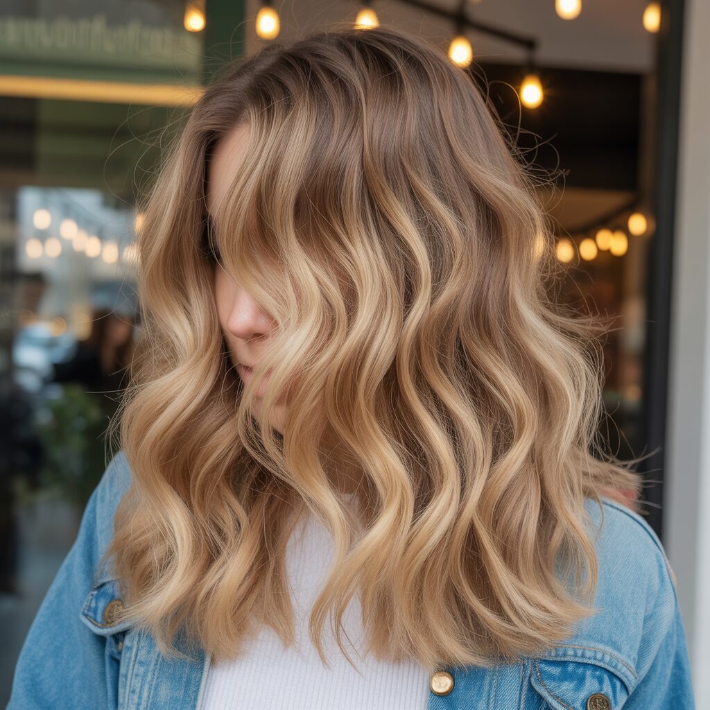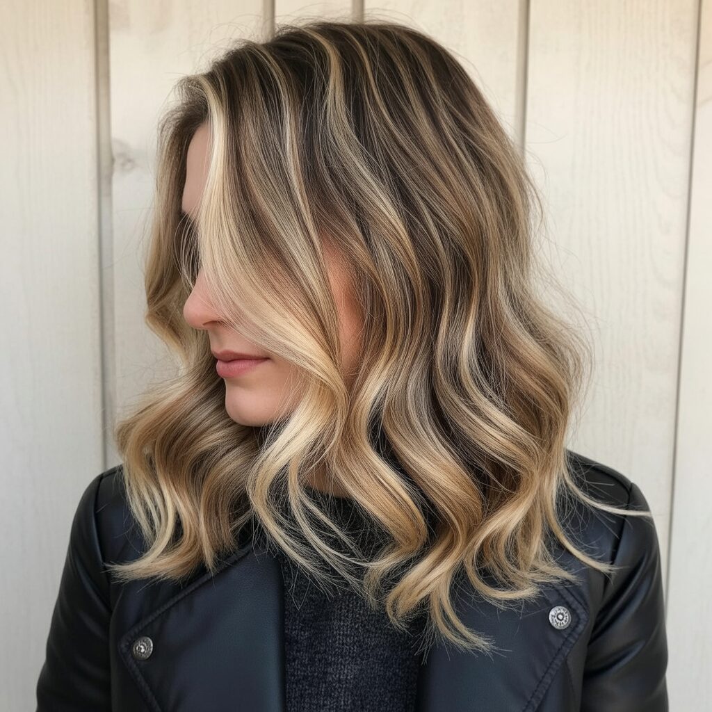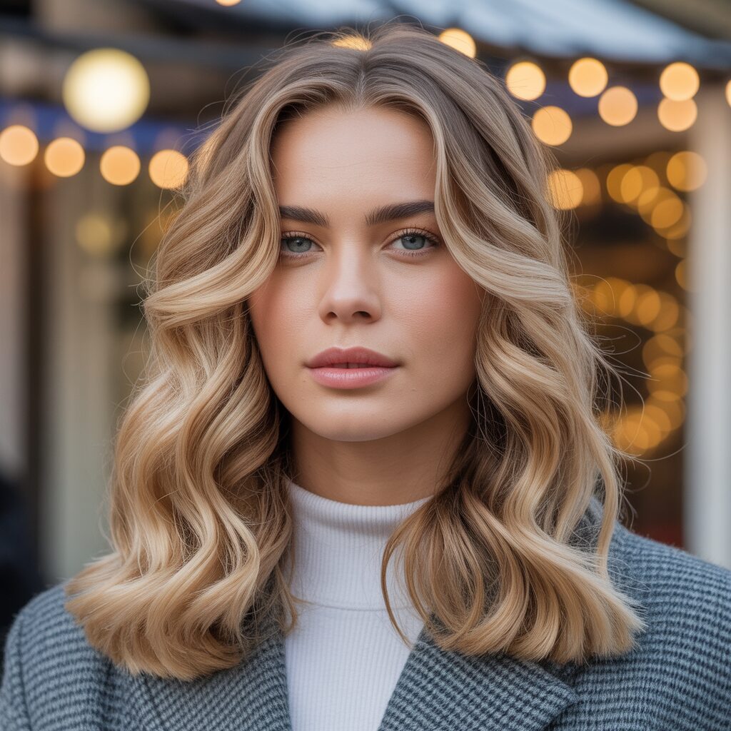 I love this shoulder-length style because it’s all about texture and dimension with a touch of warmth. A dark blonde shade enriched with honey highlights creates a radiant glow that is the perfect complement to any winter outfit. As a result, these waves have a soft, layered feel to them, giving them a look that is cozy and lush.