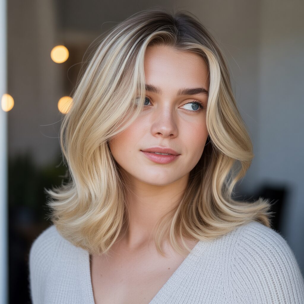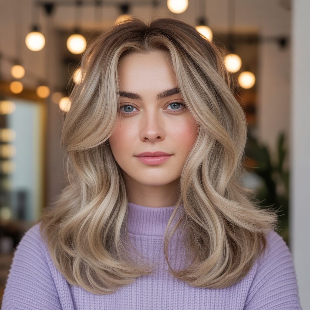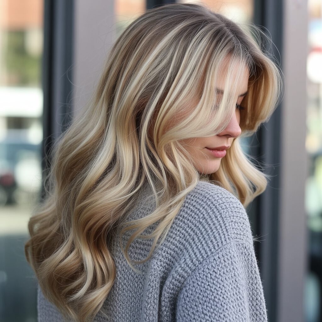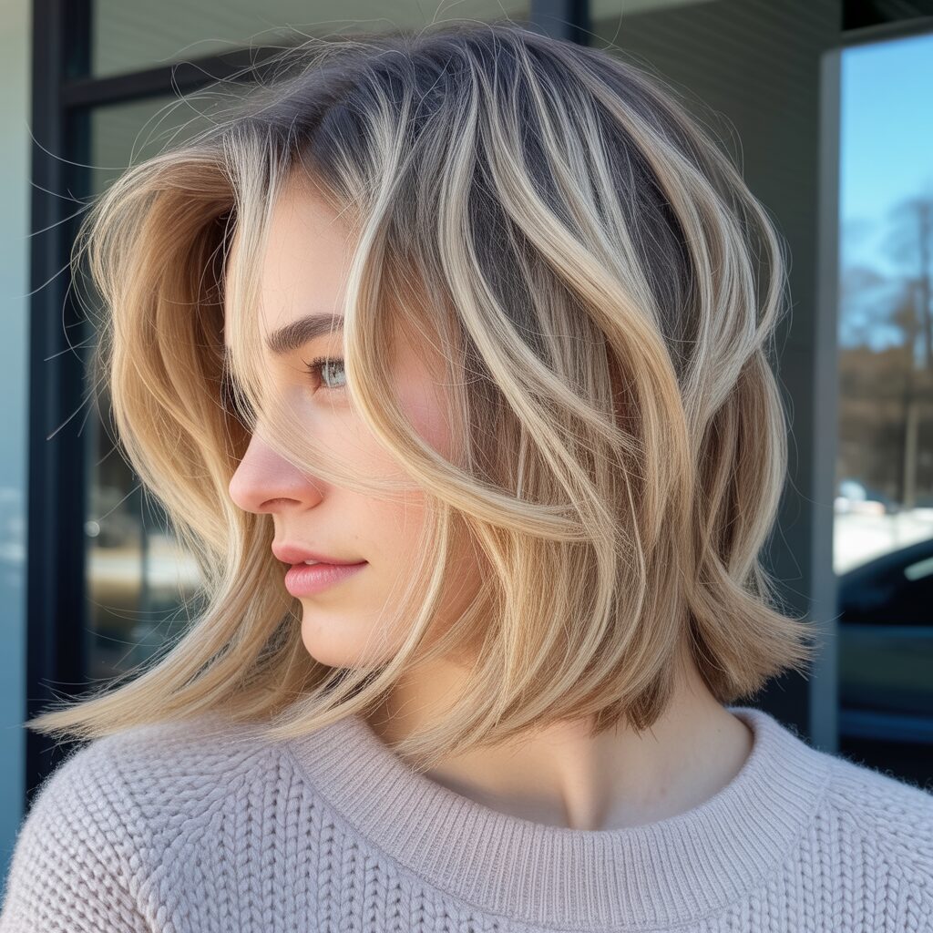 I love this shoulder-length style because it’s all about texture and dimension with a touch of warmth. A dark blonde shade enriched with honey highlights creates a radiant glow that is the perfect complement to any winter outfit. As a result, these waves have a soft, layered feel to them, giving them a look that is cozy and lush.