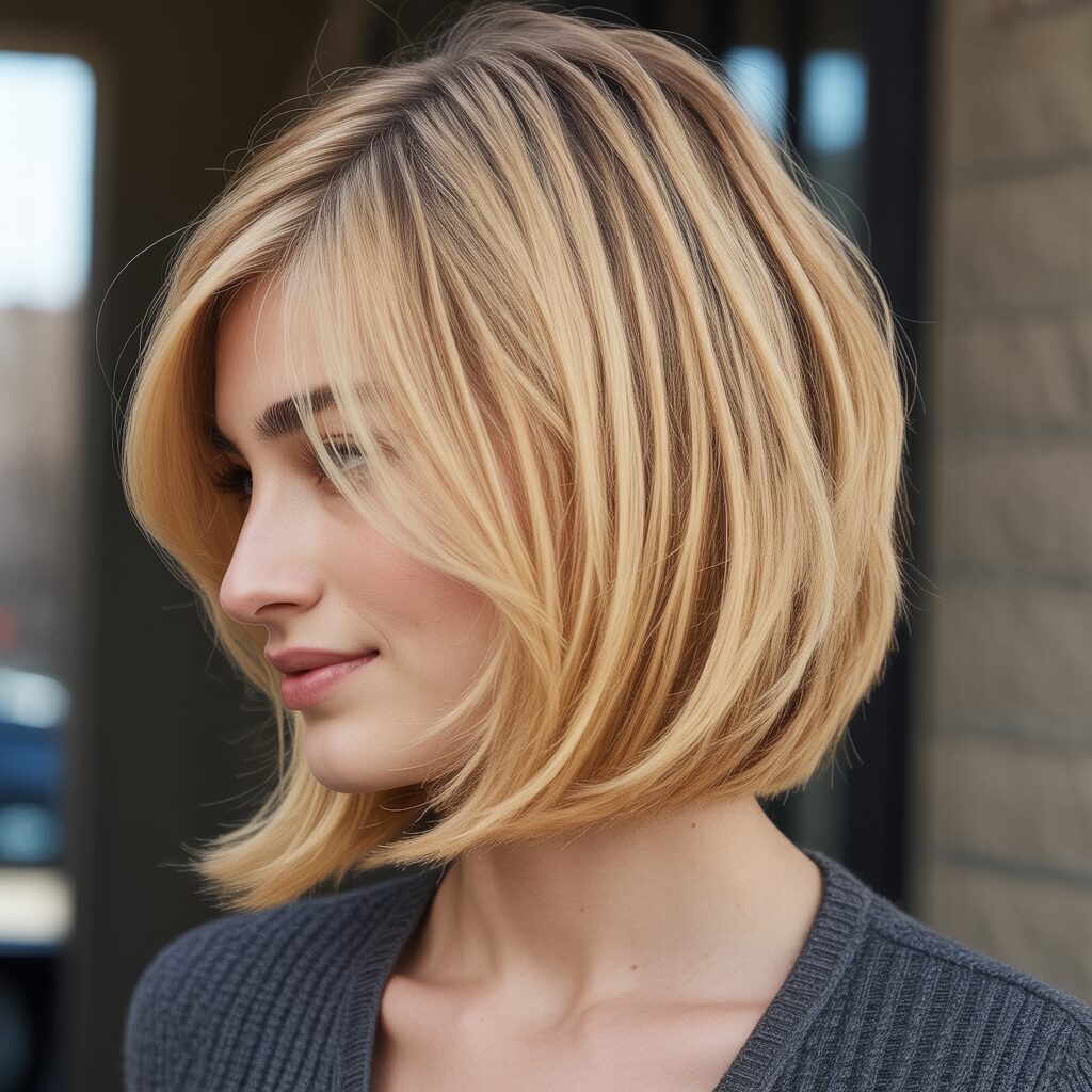 A golden blonde layered long bob with a side part