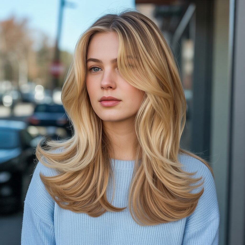 Light Honey Blonde Layers with Side Parts