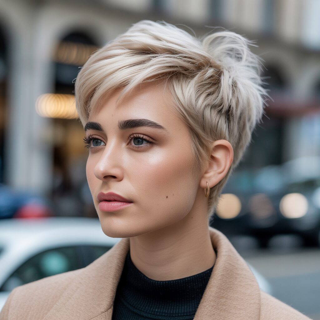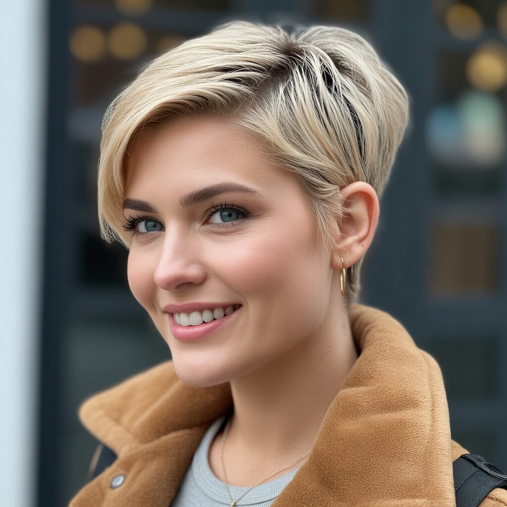 Whether it’s winter, spring, or summer, this beachy blonde pixie is a blast of sunshine. With its slightly longer top, this pixie has the perfect length for adding volume and texture with root-lifting spray or texturizing products. The blonde highlights create a warm, sunlit look, contrasting perfectly with the crisp winter air.